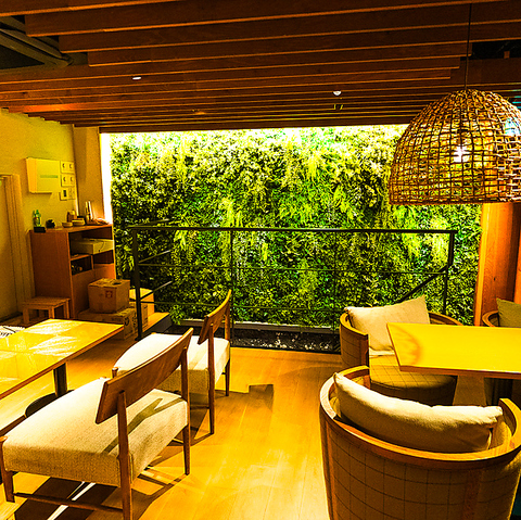 | テーブル | 1名様×10 | 店内の一角に設けられた、自然の安らぎを感じられる特別な空間。目の前の鮮やかな緑のウォールアートと、温もりある木のテーブルや椅子が調和。ベンチシートや丸いチェアなど、異なるデザインの席が配され、気分に合わせて選べます。心地よい光と落ち着いた雰囲気の中、親しい人との会話をゆったりと楽しむのに最適な特等席 |
