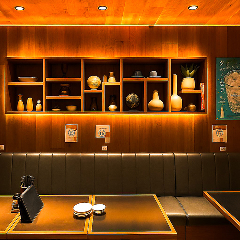 木の温もりと落ち着いた照明が包み込む、ゆったりとしたボックス席の並ぶ空間。周囲を気にせず会話が楽しめ、デートや友人との語らい、仕事帰りの一杯にも最適です。シンプルながら上質さを感じる内装は、大人がくつろげる心地よい時間を演出してくれます。
