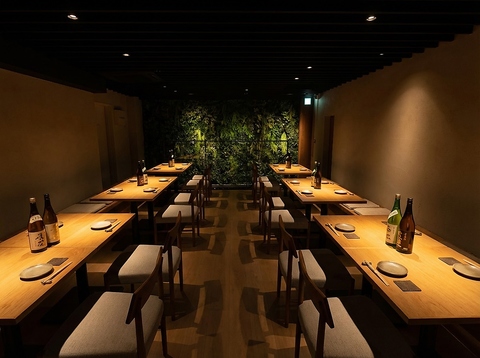 | テーブル | 1名様×30 | 店内奥の鮮やかな緑のウォールアートが目を引く、洗練された空間です。明るい木目のテーブル席が両側に整然と並び、落ち着いた照明が心地よい雰囲気を演出しています。ゆったりとしたベンチシートと椅子は、グループでの食事や宴会に最適。都会の喧騒を忘れ、旬の料理と美酒を囲みながら、和やかなひとときを過ごせます。 |