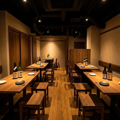 木目の美しいテーブルと椅子、シンプルながらも洗練された空間。木のパーテーションで緩やかに区切られており、周囲を気にせず会話を楽しめる落ち着いた雰囲気。暖色系の照明が、天然木の質感を際立たせ、和の安らぎを与えています。プライベートな食事や、ビジネスシーンでの利用にも最適な、大人のための居酒屋