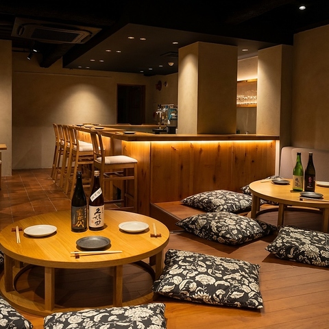 落ち着いた照明と木目の美しいL字カウンターが迎える、大人のための居酒屋。座り心地の良いハイチェアで、料理人の手さばきを眺めながら、ゆったりと一献傾けられます。奥には足を崩して寛げる座敷席も完備。テラコッタ風の床と暖色系の光が、モダンで洗練された雰囲気を演出し、心安らぐひとときを提供