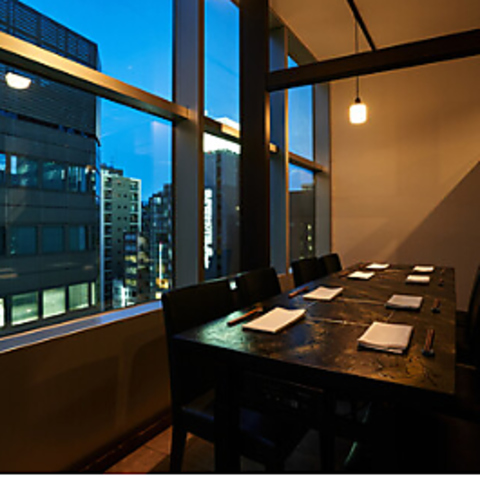店名は「人の集まる所」という意味を持つ「塒(ねぐら)」。駅からも程近い好立地ながら、大人の隠れ家。「しぶきアート」のテーブルや小物が彩る和モダン空間で、天井が高いので開放感もあり、居心地よく楽しめます。テーブル席の他、銀座の夜景も見える個室も完備し、8名様迄ご利用可能。12名様以上で貸切も○。