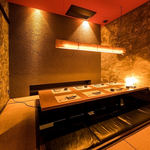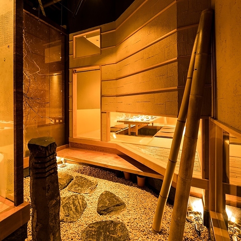 店内に一歩足を踏み入れると、玉砂利を敷いた庭園風の設えが広がり、室内とは思えない和の情緒を演出。柔らかな灯りと自然素材の質感が調和し、非日常感のある落ち着いた空間を生み出します。都会の喧騒を忘れさせる雰囲気の中で、ゆったりと料理と会話を楽しめる、大人のための上質な個室です。