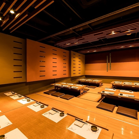 【ゆったり寛げる個室】長時間の宴会でも脚を伸ばしながら寛げる掘りごたつございます。快適な空間で大人数の飲み会にもしっかり対応◎宴会向けの飲み放題付きコース料理や、幹事様にも嬉しいクーポンも多数ご用意しております!仕事終わりにも気軽にお立ち寄りください。