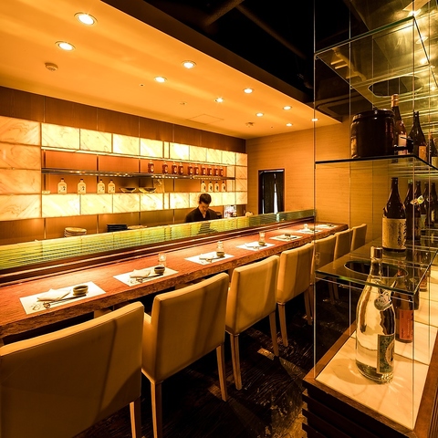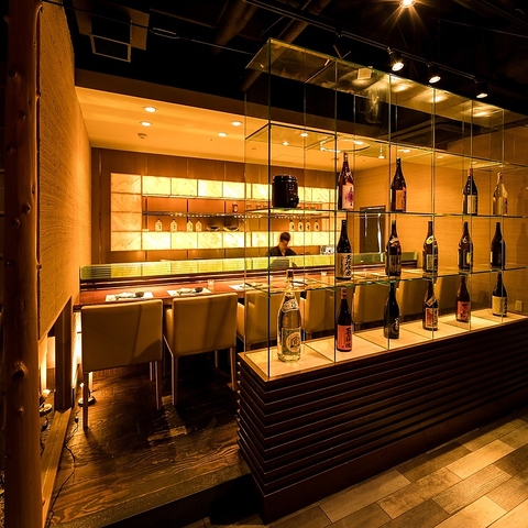 全国各地から厳選した日本酒をずらりと揃え、銘柄が映えるガラス棚と落ち着いた照明が印象的な空間。カウンター越しに料理と酒を楽しめる設えは、静かに語らいたい夜にも最適です。日本酒の奥深さを感じながら、視線や音まで計算された大人のための上質なひとときをお過ごしいただけます。