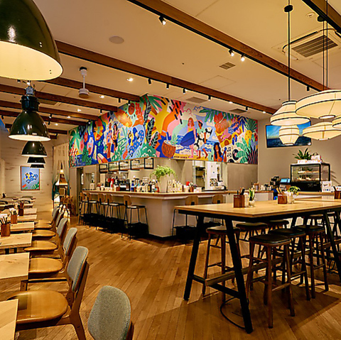 広々としたテーブル席は、お席を繋げて10名様~14名様などのご宴会も可能です。また、マイク・プロジェクター完備しております。歓送迎会などの動画もiphoneから音声と一緒に出力可能です♪店内壁面に描かれたアートワークはハワイ縁のアーティスト「Kim Sielbeck」によるもの。ゆったりとした空気感をご堪能下さい。