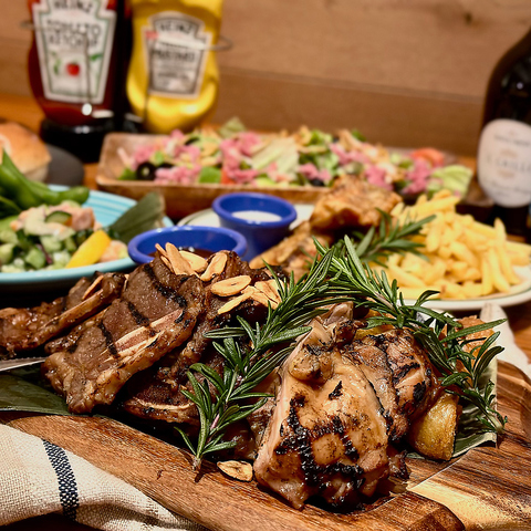 HOAの人気BBQメニューが勢揃い!気軽にBBQが楽しめちゃう贅沢なコースです。豚のスペアリブ、牛ハラミのサイコロステーキや豪快なローストチキンも楽しめる!バーガーバンズでオリジナルバーガーも楽しめちゃう大満足なコースです。嬉しい2時間飲み放題付き♪天候を気にせず気軽にBBQを★