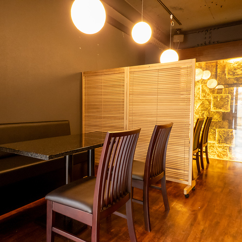 気の合う仲間との語らいや、仕事帰りのサク飲みなど、様々なシーンでお楽しみいただけるお席をご用意してお待ちしております。仕切りが設けられているため、周りを気にすることなく、まるでお家にいるかのようにリラックスしてお寛ぎいただけます♪落ち着いた雰囲気の中、美味しいお料理とお酒を心ゆくまでご賞味ください。