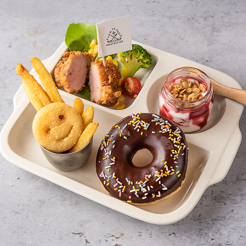 ドーナッツ(チョコレート or ストロベリー)+バターミルクフライドチキン+フライドポテト&スマイルポテト+サラダ+ミニデザート(ベリーヨーグルト)+ドリンク(オレンジ・アップル・ミルク)[特定原材料 / 乳・小麦・くるみ]