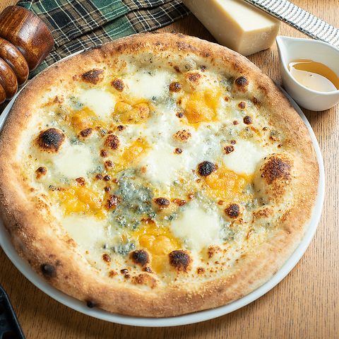 モッツァレラ、ブルーチーズ、チェダーチーズ、パルメザンチーズお好みでハチミツをかけてお召し上がりください!