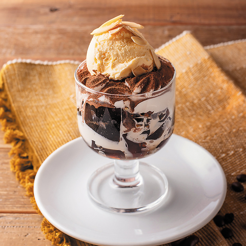 ザクザクとした食感の全粒粉ビスケットがアクセントの、濃厚なチョコレートブラウニー。そこにアイス、ホイップクリーム、チョコレートソース、アーモンドスライスをトッピングし、サンデーに仕上げました。チョコレート好きの方におすすめの1品です。