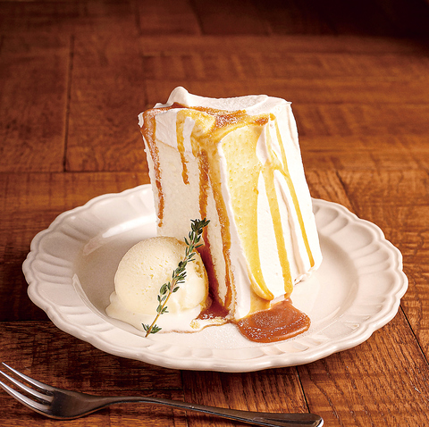 本場アメリカでは定番のこのケーキ。卵白のみで仕上げた。しっかりかつふわふわ食感の生地が特徴のシフォンケーキ。純生クリームをたっぷりとコーティングし、ヌガータイプの自家製キャラメルソースをかけたMMC*人気No.1メニューです。