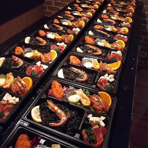 前菜おつまみ~タパス、パエリアまでついた内容充実のオードブル。ご友人やご家族の集まり、職場でのパーティー・お食事会などにぜひ!Mサイズ<2~3人前>選べるパエリア(1種類)付き¥12000/Lサイズ<3~4人前>選べるパエリア(2種類)付き¥18000(※季節食材等によりオードブルの内容は変更になることがあります)