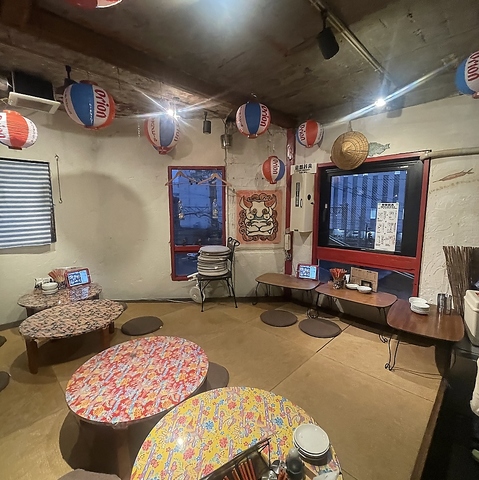 開放感あふれる座敷席が完備されているのも魅力の当店。頭上には提灯やお酒が並び、沖縄の大らかで陽気な雰囲気を演出しています。大人数でのご利用も歓迎しております!