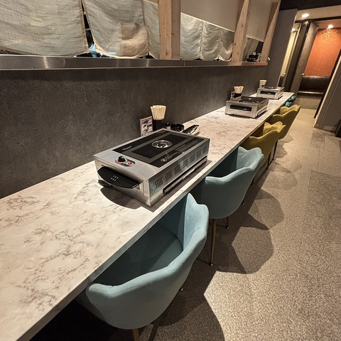 【おしゃれな空間で焼肉が楽しめる♪】カウンター席が拡張されて登場!カラフルな椅子がアクセントを添え、若いカップルや友達同士でのお食事に最適な空間となっています。プライベート感を味わいながら、リラックスした雰囲気の中おいしい焼肉とドリンクをお楽しみくださいませ★