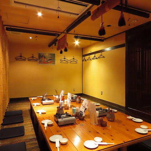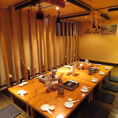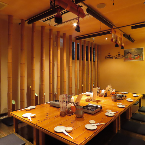ゆったりくつろげる"和"の落ち着いた雰囲気を楽しめる掘りごたつ個室席は最大10名様まで!阿波地鶏と旨い日本酒を堪能するなら竹の家で!