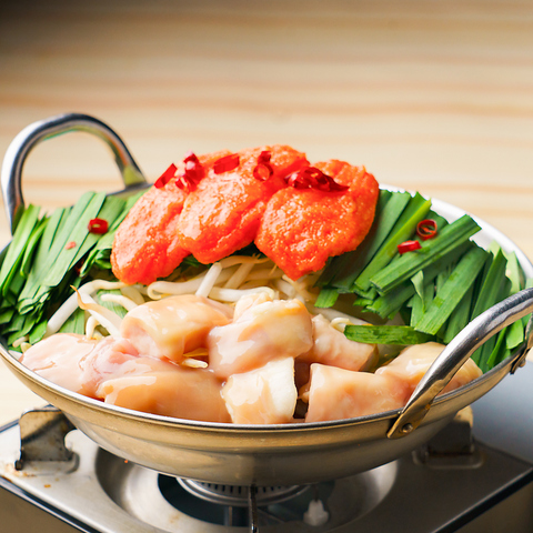 期間限定で、食べ放題で明太もつ鍋が頼み放題!明太子が絡んだ魚介スープが、もつの旨味を最大限引き立てます