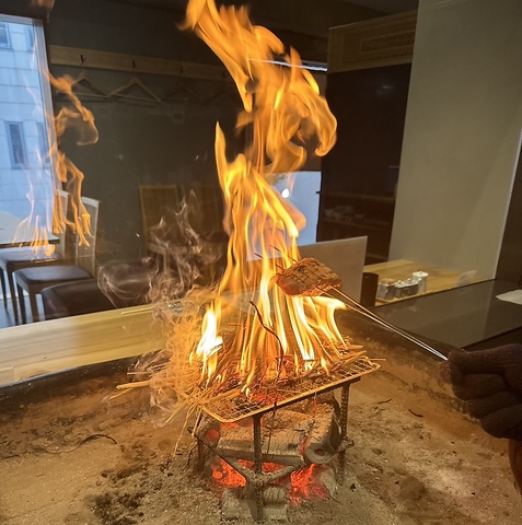 藁が燃え上がる炎 視覚的な演出も魅力のひとつです!職人の光る技をご堪能下さい。(各種コースもご用意)