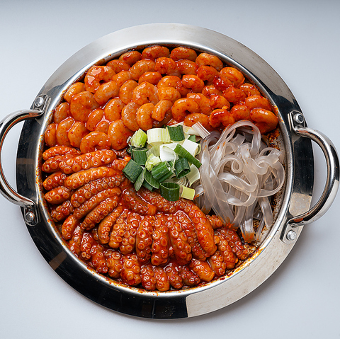 釜山式ナッコプセ タコ+ホルモン+エビの入った甘辛い海鮮鍋。ほかにも、ナッサムセ・ナッウセなどホルモンの代わりにサムギョプサル・牛バラの入ったメニューもございます。