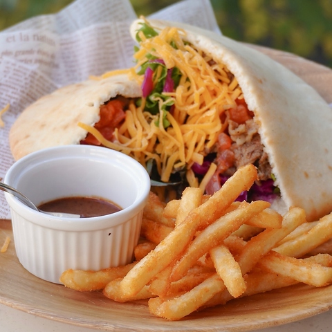 自家製牛肉ケバブのピタパン(自家製牛肉ケバブ/トマト/レタス/レッドチェダーチーズ/紫キャベツのラペ) / クリスピーポテト / ケバブソース / 日替わりミニデザート【ランチメニューすべてに Salad & Drink BAR 付き】