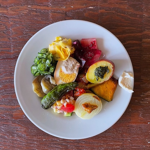 こだわりのランチは無農薬の自家製野菜たっぷり前菜盛り合わせ付き季節に合わせて最適な食材を使用したランチをご用意しております。またランチは野菜をたくさん使用した前菜プレート付き!生産者さんの想いが詰まった食材をしっかりお召し上がりください。※ランチタイム11:30~15:00/カフェタイム14:00~17:00