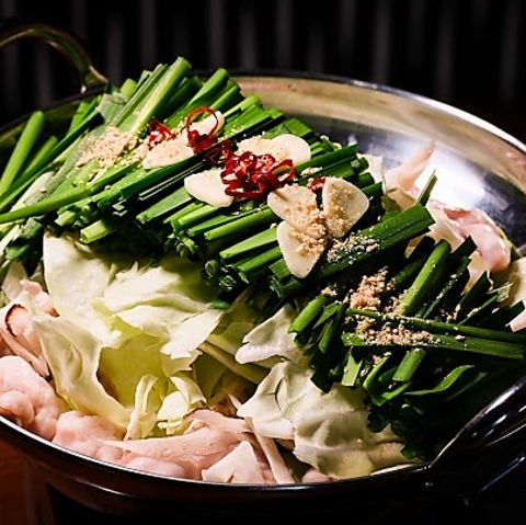 博多もつ鍋、始めました。新鮮な生もつをたっぷり使用した特製スープは、白(にんにく塩)・黒(焦がし醤油)・黄(病みつきカレー)の3種からお選びいただけます。