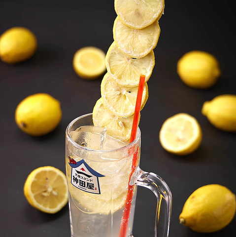 ニュー神田屋名物の「タワーレモンサワー」!お替りサワーを注ぐのがお得です♪他にも宴会や飲み会に最適なラインナップをご用意しております!ご家族とのお食事、仕事仲間との飲み会、女子会、宴会などに是非ご利用ください◎