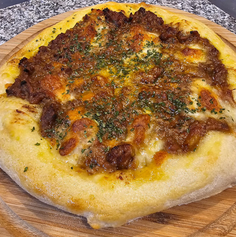 自家製ハンバーグピザは、ジューシーなハンバーグととろけるチーズが絶妙にマッチした、贅沢な味わいのピザです。ふんわり焼き上げられた生地の上に、香ばしく焼き上げたハンバーグが豊かな風味を広げ、チーズとの相性はまさに絶品。一度食べるとやみつきになる、自家製ハンバーグピザの魅力をぜひご堪能ください。