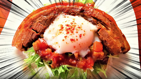 ☆2023年1月21日 TV東京 “ABChanZOO”放送☆【ラフテータコライス】シャキシャキの水菜にピリ辛サルサソース、とろけるスパイシーなラフテーにまろやかな温玉が乗ったタコライスです♪