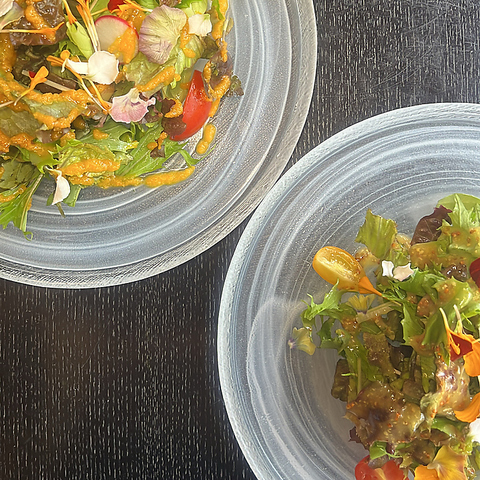 岡山の旬菜やシェフの思い入れのある食材を使用したフレッシュなサラダをシェフ特製ドレッシングで。華やかなエディブルフラワーをあしらった姿はまるでお花畑のような華やかさです。綺麗な葉の部分のみを使用した贅沢なサラダをどうぞ。