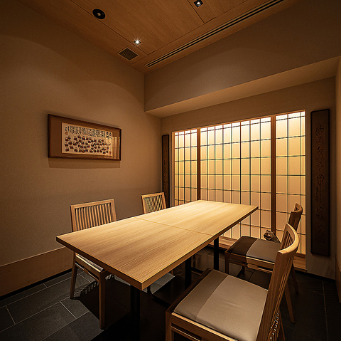 御堂筋を一望できる大きな窓は、春夏秋冬で表情を変える銀杏並木がをお楽しみいただけます。日中は光が差し込み明るい店内となり、夜はしっとりとした雰囲気に。昼・夜ともに違った雰囲気を楽しめる和空間で、こだわりの料理をご堪能ください。