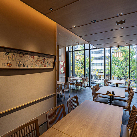 御堂筋を一望できる大きな窓は、春夏秋冬で表情を変える銀杏並木がをお楽しみいただけます。日中は光が差し込み明るい店内となり、夜はしっとりとした雰囲気に。昼・夜ともに違った雰囲気を楽しめる和空間で、こだわりの料理をご堪能ください。
