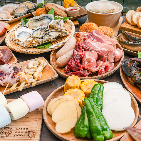 お腹も心も満たしてくれる、充実のバーベキュー食材。こだわりお肉を堪能するも、山で海の幸を愉しむも良し。お好みでチョイスして、春夏秋冬手ぶらで気軽に楽しめます◎焼肉とは違った炭火で楽しむ食事体験をウッドデザインパークで。