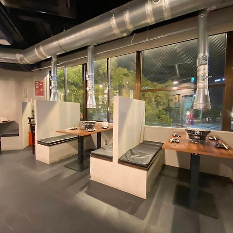 当店は、階段の上に佇む大人の隠れ家的焼肉屋。壁一面の大きな窓から外の景色を楽しめる、優雅な4名様掛けテーブル席と、2名様までのカウンター席をご用意しております。カウンター席では人目を憚らず、心ゆくまで焼肉を楽しむ時間を提供。お一人様で焼肉グルメを堪能したい方や、ご夫婦、カップルでのご利用に最適です。