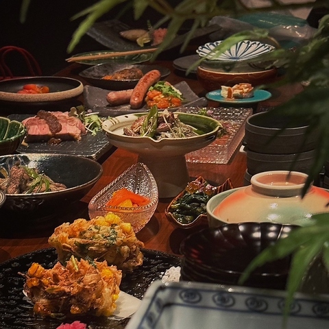 薪火の燻香まとう絶品料理をコースでご用意。『飲み放題付コース』6,000円~各種、『お料理のみコース』1種は、デザートプレート付のバリエーションなど様々なご利用シーンでお楽しみいただけます。厳選食材、薪火、信楽焼をはじめとした色とりどりの食器、こだわりの内装空間すべてが美味しさを引き立てます。