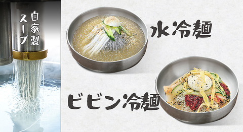 「水冷麺」はコシのある細麺と様々な食材で作られた自家製スープがクセになる美味しさ!ビビン冷麺とのハーフ&ハーフでもお楽しみいただけます♪