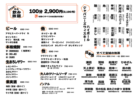 | 利用条件 | ◆プレミアム(P)マークを除く全てのお酒飲み放題!◆当日利用OK♪お気軽にお申しつけください。◆内容は日々変動致します。詳しくはドリンクTOPのメニュー写真をご確認下さい |