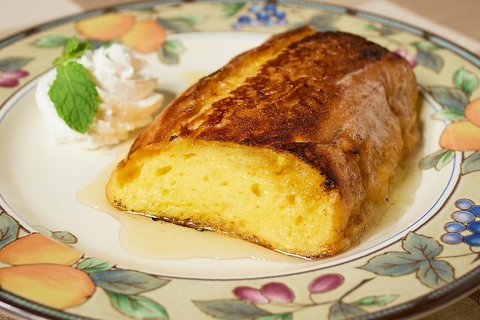バゲットを卵液に浸して、皮目をじっくり・カリッと焼き上げます。フランスでは「パンペルデュ」といいます。甘いバニラとお砂糖、ほんのりラム酒の香りです。思いのほかペロッと食べられます☆【トッピング】ホイップ 50円(税込)/果物のコンポート 100円(税込)/チョコソース 50円(税込)