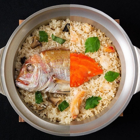 鯛めしに使用する天然鯛は日本有数の漁獲量を誇る糸島市の伊都菜彩より仕入れております。またその他、旨みが滲み出す蟹めしのコースもご用意。和食や海鮮料理の技術を磨いてきた料理長だからこその逸品の数々がテーブルを華やかに彩り、粋で洗練された味わいで極上のひとときをお楽しみください。