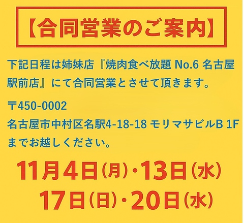 11月4、13、17、20日は姉妹店『焼肉食べ放題 No.6 名古屋駅前店』にて合同営業とさせていただきます。