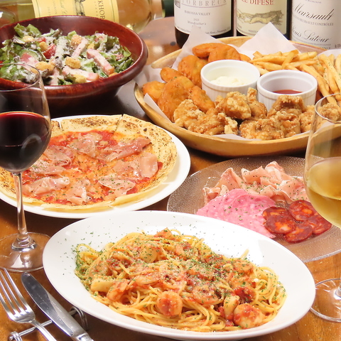 前菜やパスタ、ピザ、お肉など、お酒と相性抜群の料理を取り揃えたボリューム満点の貸切コース