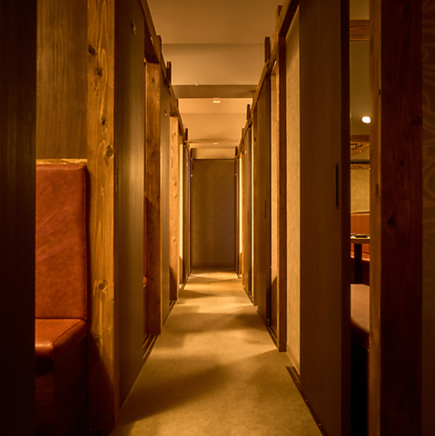 個室への通路、お部屋までの臨場感も大切にしております。扉付きの個室となりますので、ご接待や会食、記念日などプライベートな空間でお食事や商談をお愉しみいただけます。