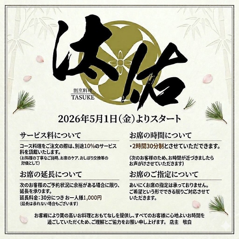 洗練された和の空間で、旬を愉しむ贅沢な夜。静かに流れる時間と匠の技が織りなす、大人の隠れ家。※お席の延長に関しては次のお客様のご予約状況に余裕がある場合のみ承ります。 延長料金:30分につきお一人様1,000円(延長は承れない場合もございますのでご了承下さい。)