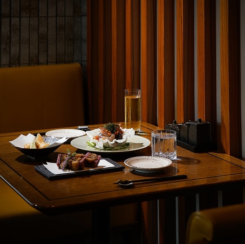 【和×モダンが基調の落ち着きのあるテーブル席】シェフお任せコースからアラカルトまでお好みのメニューと一緒に、鹿児島が誇る名酒を心ゆくまでお楽しみください。大切な記念日や、恋人のお誕生日など、素敵な1日の締めくくりにぴったりのお店です。