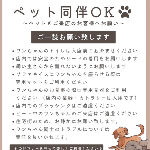店内でわんちゃん同伴OK。専用フードもあり食事もカフェ利用も一緒に楽しめるペットフレンドリーなお店♪
