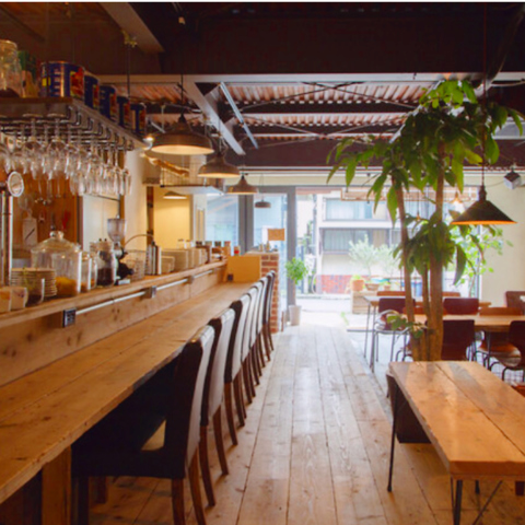 広々としたテーブル席は、ベビーカーごと入れるゆとりのレイアウトで、ファミリーにも安心の使いやすさ。わんちゃん同伴もでき、昼はカフェとしての利用はもちろん、しっかり食べられるランチを目当てに訪れる常連さんも多い人気のエリアです。夜は一人飲みから友人同士の集まりまで幅広く対応しております♪