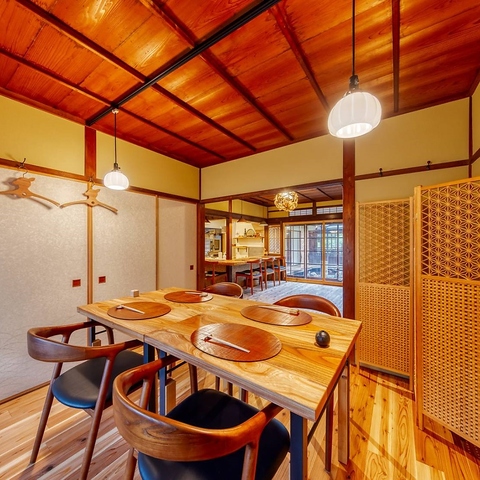 築約100年の古民家をリノベーションした当店は、ノスタルジックな雰囲気ながらも店内はスタイリッシュな空間が広がっており、各所で上質な和の趣を感じていただけます。大将の調理を間近でご覧いただけるカウンター席は五感で愉しめる人気のお席です。