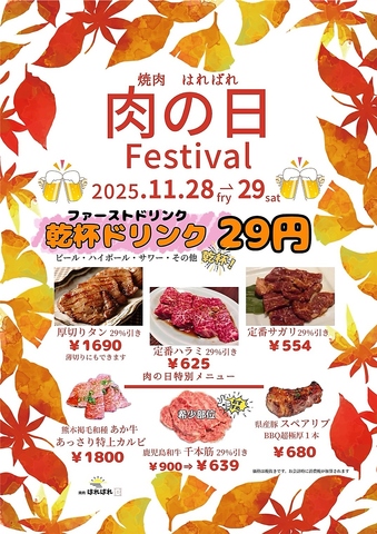 11月28日29日限定!乾杯ドリンク29円など、肉の日フェスでお得に楽しもう!※予告なしで変更の可能性あり