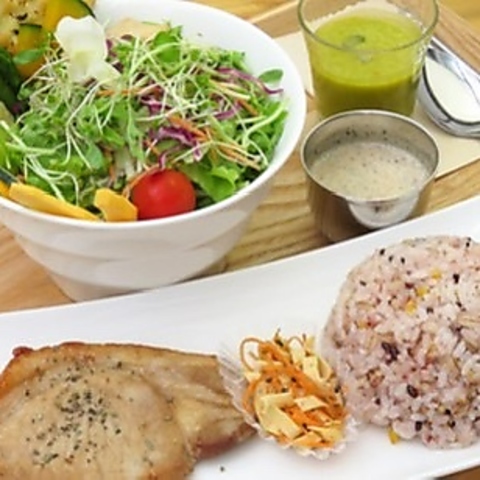 サラダ(大)、スープ、【ポークorチキンor魚】【白米or雑穀米orロールパン】+200円(税込)でセットドリンクお付けできます。