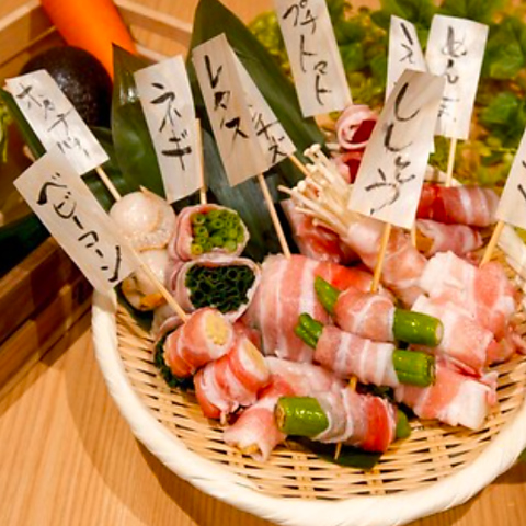 新鮮な野菜に豚肉を一本一本丁寧に巻き上げ、じっくりと焼き上げました!ヘルシーなのでついつい食べ過ぎても安心です(笑)種類も10種類以上!人気のレタス、カマンベールチーズ、トマトなど、お好みのものを選んでお召し上がりください♪